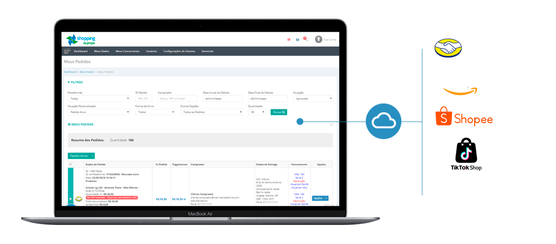 Com o Shopping de Preços é possível gerenciar todo o processo de venda, estoque, preços e envio dos pedidos totalmente integrado com lojas virtuais e marketplaces.
